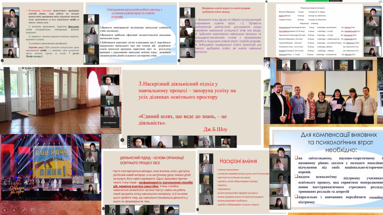 У підсумковому виступі директор школи Ольга Миколаївна зазначила, що новітні технології, які впроваджують педагоги закладу, дають свої плідні результати. Про це свідчать результати освітнього процесу. У цьому навчальному році ми маємо 10 переможців ІІ етапу Всеукраїнських учнівських олімпіад з базових дисциплін, є перемоги у відомих мовно-літературних конкурсах, багато переможців у різноманітних конкурсах різного рівня, є перемога – ІІІ місце – у всеукраїнському конкурсі-захисті науково-дослідницьких робіт МАН. Секрети успіху – у сумлінній, наполегливій праці вчителів, здобувачів освіти та батьків. І це достойна відповідь на виклики часу!