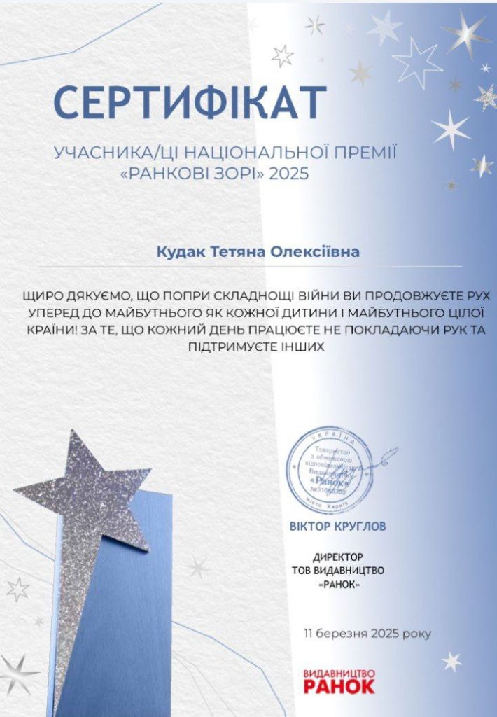 Вітаємо Кудак Тетяну Олексіївну — учасницю Національної премії «Ранкові зорі»!