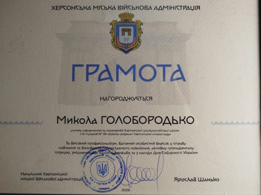 МИКОЛУ ГОЛОБОРОДЬКА сьогодні вітали із заслуженим визнанням його професійної діяльності, гідної громадської позиції та великого особистого внеску у справу волонтерства у рідному Херсоні! Школа-родина 39 пишається своїм героєм! Соборна Україна непоборна, коли є такі патріоти!